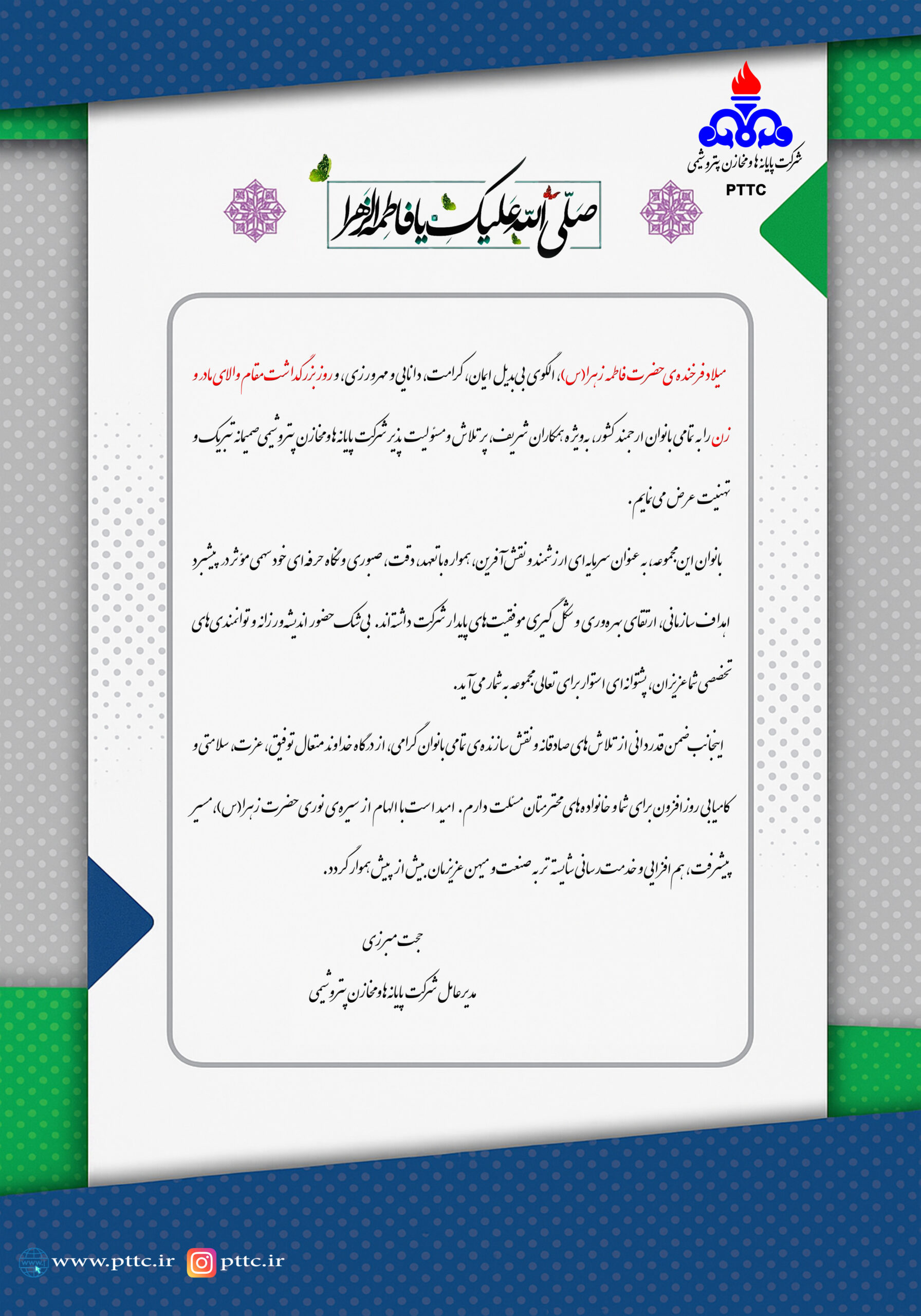 مدیرعامل شرکت پایانه ها و مخازن پتروشیمی در پیامی، فرارسیدن ولادت حضرت فاطمه الزهرا(س) گرامیداشت مقام مادر و روز زن را تبریک گفتند.