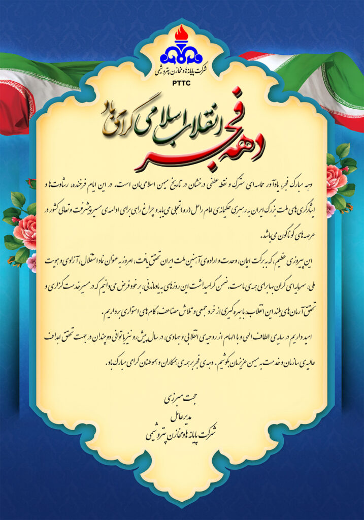 مدیرعامل شرکت پایانه ها و مخازن پتروشیمی در پیامی، فرارسیدن دهه مبارک فجر را تبریک گفتند.
